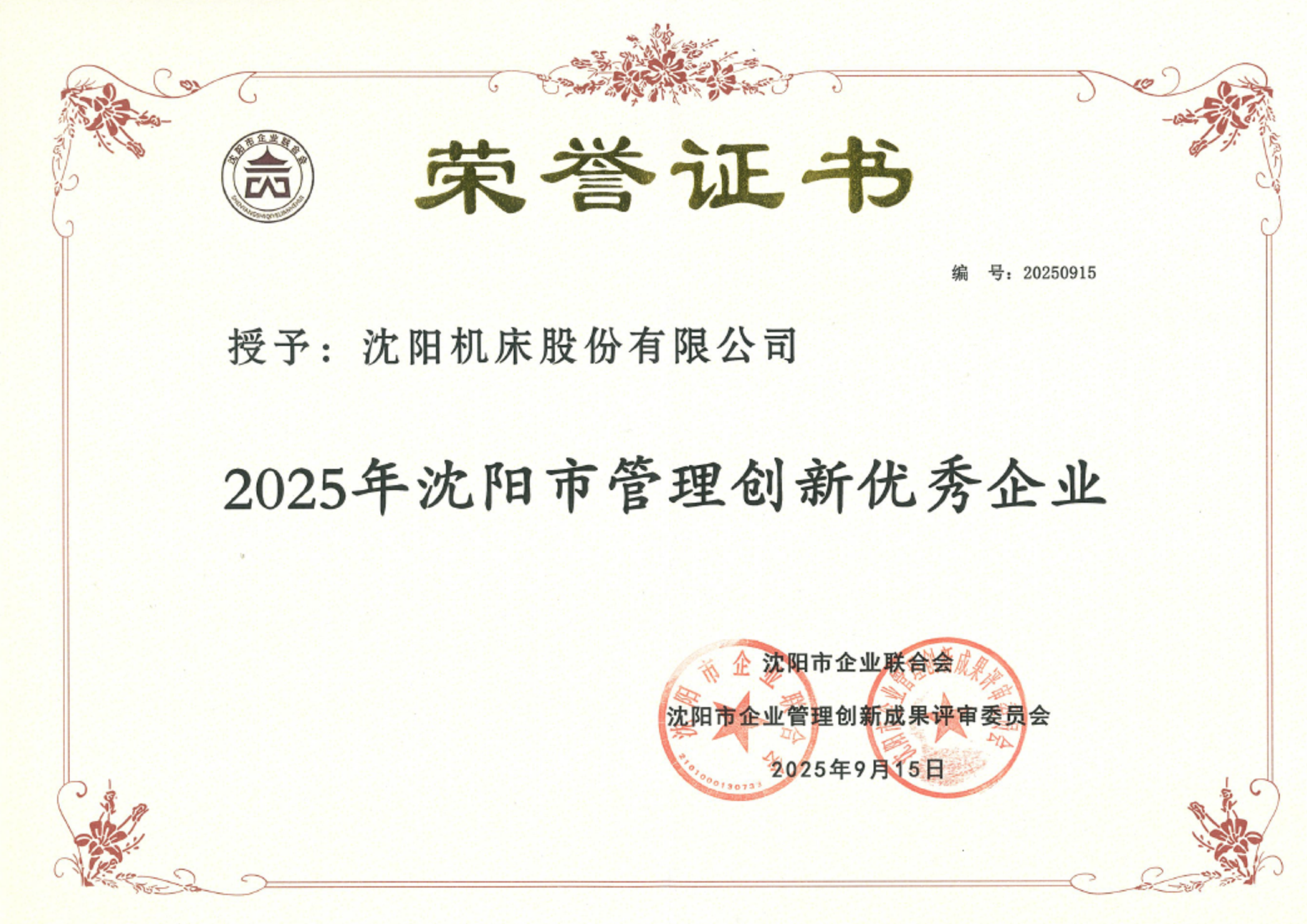 近日,通用技術(shù)沈陽機(jī)床獲評“2025年沈陽市管理創(chuàng)新優(yōu)秀企業(yè)”。
